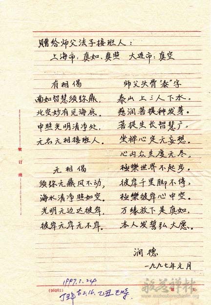 润德师父(1917-2007),俗名杨润德,是滌华禅师(1910-1996)的胞妹。生于1917年8月16日(农历六月廿九日)。2007年1月15日(农历十一月廿七日),圆寂于苏州光福般若禅林,享年90岁。 润德师父从小心地善良宽厚,对待父母非常孝顺。未出嫁时,每天亲自给家人、店员每人做荷包蛋一只,而她自己却不吃。好东西总是让给别人,自己吃用剩下的和不好的。行事宁愿自己吃亏,也不愿别人吃亏,总是默默地帮助他人。出嫁后孝顺公公婆婆,照顾小叔和小姑子,深得公婆一家人欢喜。婚后生过两个男孩,五、六岁时都突然生病死了。润德师父特别喜欢孩子,侄子侄女、邻居家孩子,都当自己的孩子一样看待。师父在家时职业是裁缝,遇到顾客家中有结婚或去世等特殊情况,经常急人之所急,通宵为顾客赶做衣裳。上世纪六七十年代,丈夫和别的女人有了私情,生了个女儿,师父却不嗔不怒,以宽容心对待。丈夫因作风问题坐牢期间,她经常做些好吃的,步行几小时到农场送给丈夫吃。数十年过去了,丈夫生病住院,临死时请她将那个私生女当自己的女儿看待,说那孩子将来会照顾你,为你送终。师父说,你放心,我会对她关照的。后来师父把家里仅有的两间房产中的一间赠送给了丈夫的私生女。那孩子得了房子后却对师父不闻不问,师父后来生病手术时分文不出,亲友们都愤愤不平,而润德师父却若无其事。 一九九二年初,滌华禅师前往淮安赠送《金刚经注解》时,胞妹杨润德皈依于禅师。滌华禅师说:“润德”这个名字好。为其取法名时仍然为“润德”。 润德师父皈依时已76岁了。皈依后,以在家居士身,放下一切世俗挂念,一心修行。同年离开淮安俗家,前往苏州圣恩寺常住,干活护持寺院。 一九九三年农历二月初九,润德师父和侄女真照师父(当时都为在家居士),一同皈依于苏州圣恩寺上融下宗老和尚,得法名“慈德”。自来到苏州后,师父就不再回淮安老家,与真照师父相伴居住在圣恩寺内,为寺院烧饭煮茶、做针线活等。每天按照滌华禅师的两本法宝修行,平常功课诵金刚经、心经、楞严咒、大悲咒,有空就学习《金刚经注解》及《心经感•般若觉》,及坐禅。夜里睡不着时就起来打坐。因年纪大了,打坐为单盘或散盘。 润德师父于九四年农历二月十九日,在慈云寺皈依于上德下林老和尚,得法名“文转”。九五年农历九月十九日,和真照师父一同在宝华山隆昌律寺从上慈下舟老和尚,受在家菩萨戒。一九九六年农历三月,滌华禅师圆寂,润德师父和真照师父在金山寺下院绍隆寺,一同为禅师法体守灵一个多月直至荼毗。农历四月,在金山寺下院观音禅寺皈依于上肇下田和尚,得法名“自德”,在观音禅寺住了一个月后和真照师父回到苏州圣恩寺。 1996年10月20日至11月30日,滌华禅师的法子真照,俗家女儿杨淑兰,于宝华山隆昌律寺剃度出家,受比丘尼戒,担负起延续如来禅法脉的历史重任。后润德师父与真照师父相伴一同在苏州光福司徒庙常住。1998年,经司徒庙品华师父介绍,承蒙苏州光福镇镇长吴金木与香雪村书记顾雪康大力支持,经当地政府部门批准, 释真照师父为完成滌华禅师生前慈盼,在苏州光福镇香雪村一片沼泽地上,开始筹划建设滌华禅师如来禅法脉传承及实修之所。在润德师父、大觉等禅师诸多弟子的全力支持及护法者的帮助下,1999年12月,纯禅女众道场——般若禅林建成。上真下照师父担任禅林住持。从此,润德师父作为居士一直在禅林常住,陪伴护持真照师父,修持如来禅法。禅林无事时润德师父经常自行闭关几天不等,闭关期间阅经、坐禅,止语,精进用功。2002至2003年间,润德师父在禅林精进闭关了整整一年时间。 润德师父一生受了不少病苦。2000年,润德师父眼睛患白内障,一只眼病情严重,开刀治疗,另一只眼因为较轻微,为省钱没有开刀,后来这只眼恶化成青光眼。2002年,润德师父又因患胆结石去上海治疗。2004年7月,那只先前未开刀的眼睛因患青光眼恶化而被迫动手术,开刀摘除了眼球。润德师父因岁数大了,不适合打麻药,手术就在没有打麻药的情况下进行。师父在开刀过程中默念心经而不觉得痛苦难忍。 2004年11月17日(农历十月初六),润德师父在般若禅林剃度出家,受沙弥尼戒。是年师父88岁。师父出家后,同以往一样,每日早课诵楞严咒、大悲咒、金刚经、心经,有空就参阅滌华禅师法宝和《六祖坛经》、坐禅,经常一个星期、一个月地闭关修行。 2007年1月3日(农历十一月十五日),僧人剃头日,剃头的师傅上禅林来,润德师父却说不剃了,死的那天再剃。剃头师傅说不敢,只敢剃活人。1月13日前后,师父自己洗澡更衣,并说就穿这个衣服走了,死后只需加个海青、搭衣即可。还向不同的人有所交代与托付。润德师父对滌华禅师弟子真慧说,请她多护持禅林、帮助真照师父,我年纪大了,没有用了,帮不了什么忙了。当时禅林请了一位淮安的老太太帮忙做豆浆,师父对老太太说,我跟你只有四十天的缘。老太太是中午来到禅林的,而师父走时也是中午,正好四十天。 2007年1月15日(农历十一月廿七日)中午,润德师父说今天不吃饭了,让真照师父到她的房间来吃饭。11点叫来剃头师傅上门剃头。剃完头,洗净后,12点多,润德师父说,我要休息了。躺下就安详地走了。大家觉得师父躺下后非常安静,没有一点声音,感到奇怪,一试探已经没有呼吸了。在场目睹者有:真照师父、滌华禅师弟子大明、应明、剃
